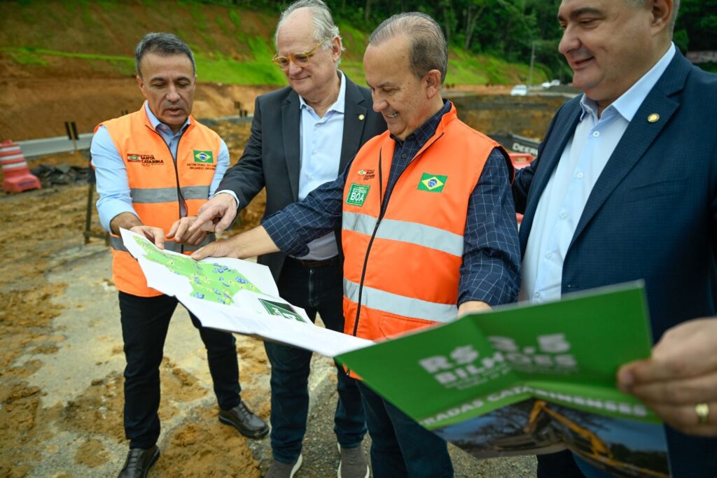 O governador Jorginho Mello vistoriou nesta segunda-feira, 14, as obras da SC-108, no trecho Massaranduba – Guaramirim. Em especial, os trabalhos no Viaduto Bruhmuller. O Governo do Estado está duplicando um trecho importante da SC-108 no Norte de SC, que é uma das principais artérias para levar a produção para os portos no Litoral.