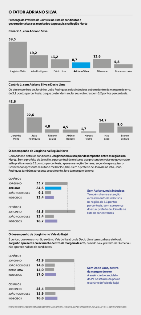 A nova pesquisa com o nome do prefeito Adriano embaralha o jogo, leva a disputa para o segundo turno e tira o favoritismo do governador Jorginho Mello, até agora seu aliado. O colunista Upiara Boschi já trouxe os números com exclusividade (leia aqui). Jorginho ainda lidera com 39,5%, seguido de João Rodrigues, com 19,2%, e Décio Lima com 13,2%. O prefeito de Joinville tem 8,3%. Esses índices levam, a menos de um ano da eleição, a disputa para o segundo turno.