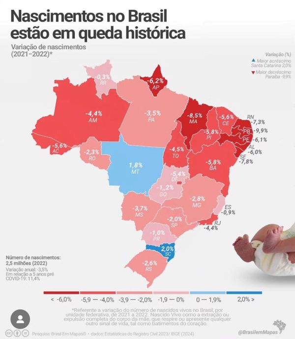 Em 2022, o Brasil registrou 2,5 milhões de nascimentos, uma queda de 3,5% em relação a 2,6 milhões no ano anterior, o menor nível desde a década de 1970, segundo a Estatística de Registro Civil. As regiões do Nordeste (-6,7%) e Norte (-3,8%) tiveram os maiores recuos. O Estado com a maior queda foi a Paraíba, com 9,9%. Os únicos Estados com acréscimo nos nascimentos foram o Mato Grosso (1,8%) e… Santa Catarina (2,0%).