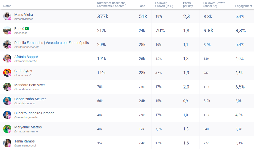 Apesar de seguir crescendo, o presidente João Cobalchini vem desacelerando nas redes e tem muito potencial para voltar a ocupar o top10 da casa. Diácono Ricardo e Marquinhos melhoraram bem seus indicadores em relação ao ano passado e tem resultados promissores.