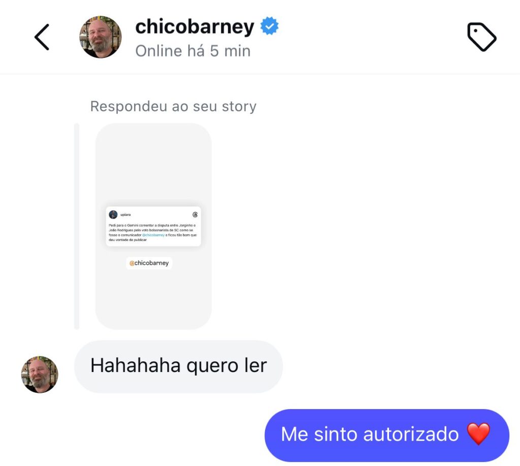 Pensando nisso, pedi à inteligência artificial Gemini uma análise sobre a disputa entre Jorginho Mello e João Rodrigues pela atenção dos bolsonaristas de SC como se fosse o comunicador Chico Barney. O resultado impressionou e despertou a curiosidade do próprio colunista.