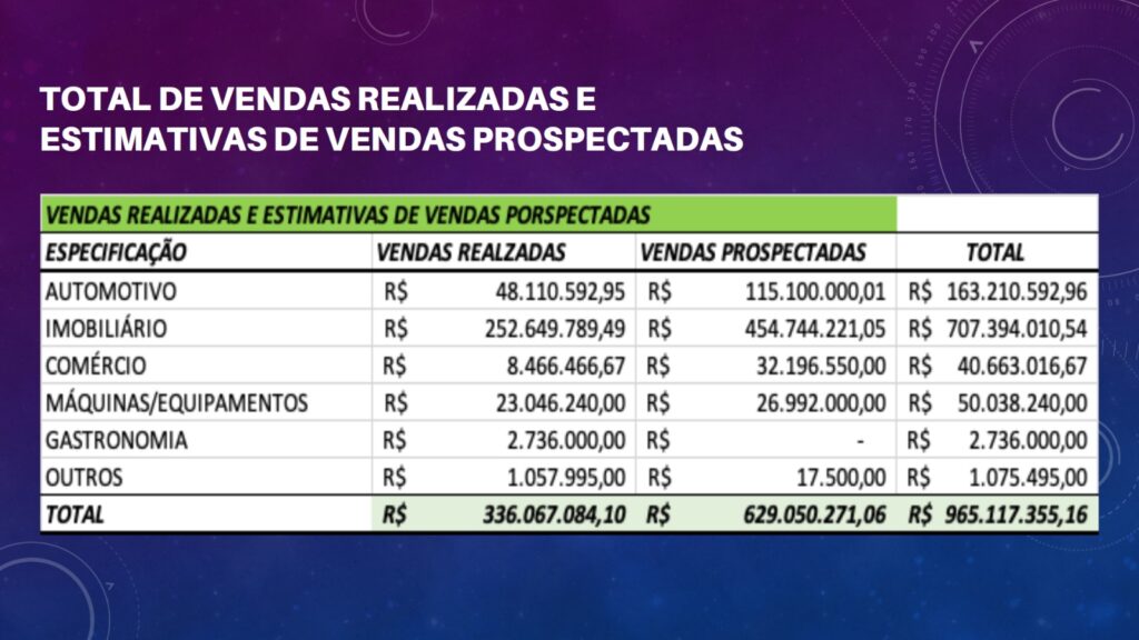 O coordenador geral da feira e secretário de Desenvolvimento Econômico, Turismo e Inovação do Município, Márcio da Paixão Rodrigues, apresentou os números levantados em pesquisa com os expositores. Foram R$ 336 milhões em negócios realizados, R$ 629 milhões em negócios prospectados, totalizando R$ 965 milhões. Destaque para o setor imobiliário, que vendeu R$ 252,6 milhões durante a feira e prospectou mais 454,7 milhões em negócios.