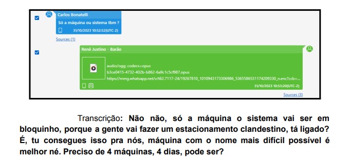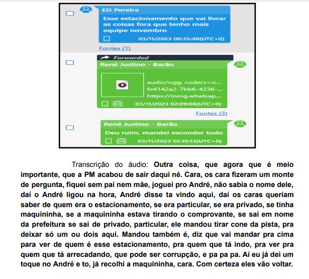 Dentro do inquérito, uma conversa entre Renê Raul Justino (preso em 29 de maio) e o empresário Carlos Eduardo Pereira Bonatelli, datada de 31 de outubro de 2023. Nela, ambos conversam sobre a cobrança de um estacionamento clandestino na Fenaostra, realizada no Centro de Florianópolis.