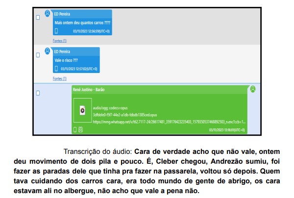 “O diálogo mostra claramente que eles empregaram a mão-de-obra de pessoas que pernoitavam no abrigo localizado na Passarela Nego Quirido, destinado a pessoas em situação de rua”, escreve a Polícia Civil em seu inquérito.