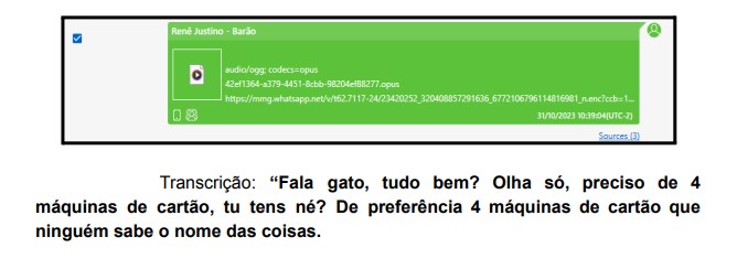 No entanto, a conversa segue e Renê conta para a Ed Pereira que a Polícia já estaria desconfiada do esquema. Confira o áudio transcrito pela Polícia Civil: