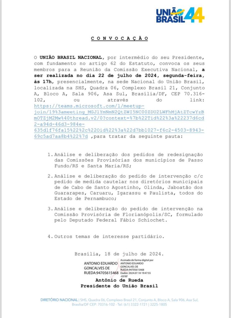Veja o documento da executiva nacional do União Brasil