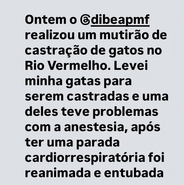 É desafiador levar suas três gatinhas para castrar e uma delas não voltar ao normal após a castração. Foi o que aconteceu ontem com a Elizabeth, a gata preta, também conhecida como Morceguinha, do tutor Leonardo Campos, morador do Rio Vermelho, em Florianópolis. Devido à incidência de esporotricose no bairro, a Prefeitura, depois de muitos meses, chamou a terceira colocada no pregão para realizar o procedimento já há muito tempo requerido pela comunidade. O município estava há mais de um ano e meio sem mutirões de castração para felinos, mesmo tendo feito o pregão eletrônico em abril de 2024. A gatinha ficou em estado comatoso após ter uma parada cardiorrespiratória durante o procedimento de esterilização.