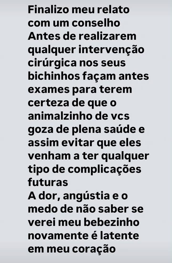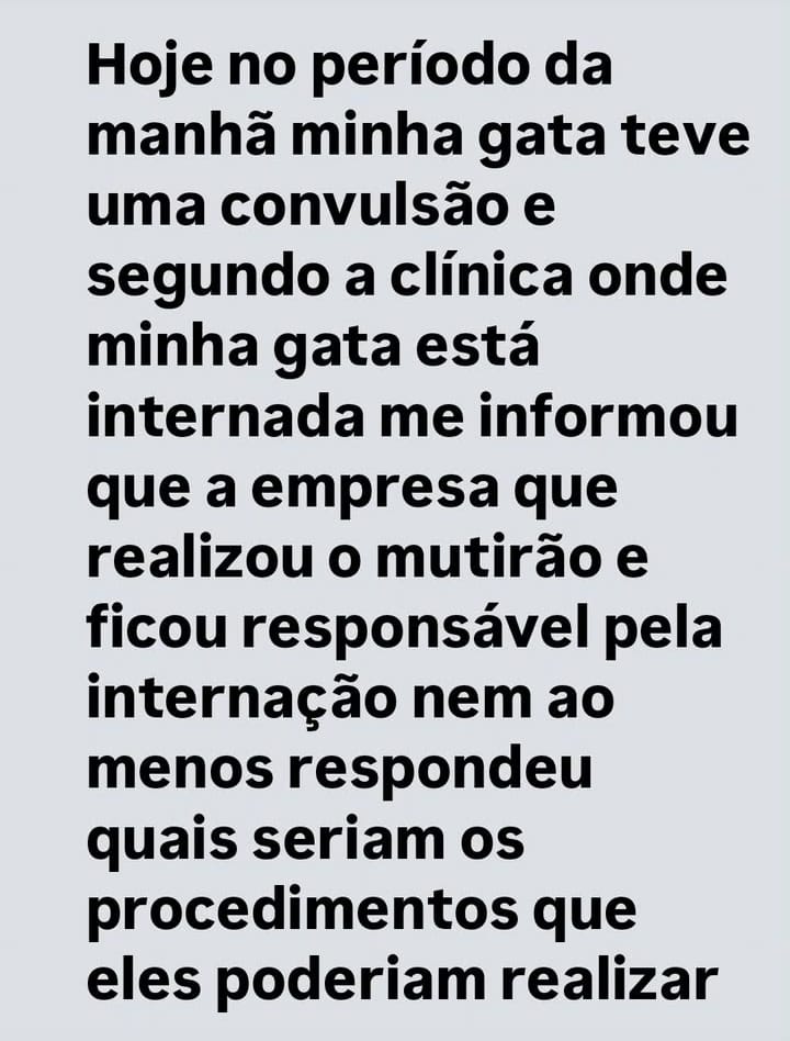 A situação de Elizabeth chega a ser escandalosa. A empresa contratada é que diz o que pode ser feito? Como assim? Ela não foi colocada em uma clínica veterinária? E não são os veterinários, que estão com os animais, que sabem o que é melhor fazer? Então, que assim seja. Já que a gatinha teve uma intercorrência em um procedimento habitual, em geral sem riscos, então que seja realizado tudo para a sua pronta recuperação.