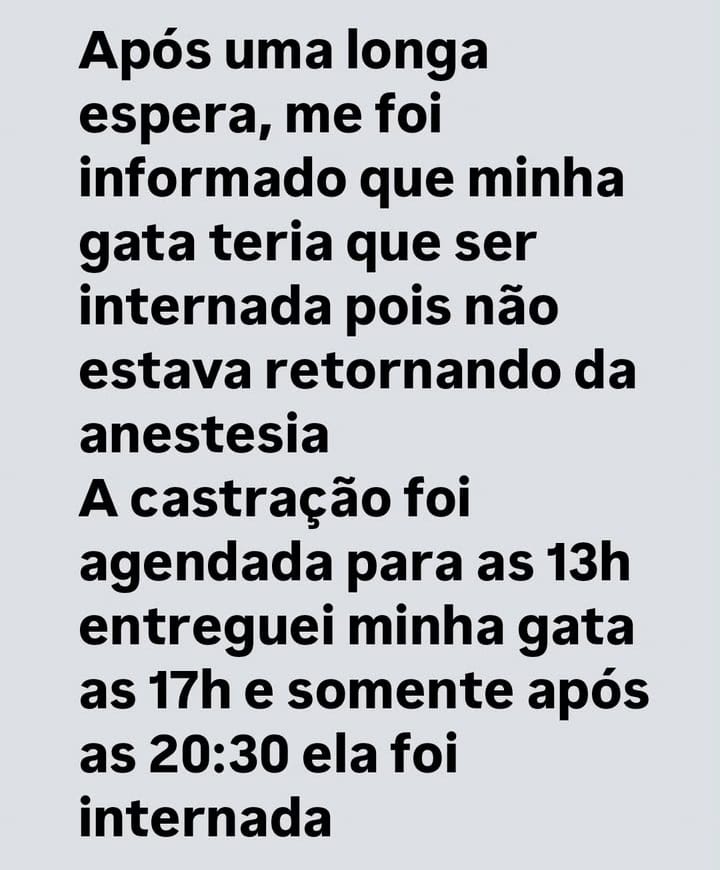 Consultado, um veterinário especialista em felinos, deu a seguinte declaração: “Quando um animal é submetido a procedimento cirúrgico, é dever do profissional médico-veterinário garantir que todas as etapas sejam conduzidas com responsabilidade, conhecimento técnico e profundo respeito à vida. A ética deve estar presente em todo o processo: no pré-cirúrgico, no transcirúrgico (durante a cirurgia) e no pós-cirúrgico. Cada momento importa. Cada detalhe faz a diferença na segurança e recuperação do paciente. Eventuais complicações anestésicas ou cirúrgicas não devem ser tratadas com banalidade. Todo animal que apresente intercorrência durante, ou após a cirurgia, deve ser imediatamente internado e estabilizado com suporte adequado, visando o restabelecimento de suas funções vitais. No caso específico de felinos, há uma atenção redobrada por parte dos especialistas. Existe um conceito amplamente conhecido entre nós: a “tríade da morte”, composta por hipoglicemia (queda de açúcar no sangue), hipotermia (queda de temperatura corporal) e hipovolemia (redução do volume sanguíneo). Esses três fatores, quando presentes, aumentam consideravelmente o risco de óbito em gatos durante procedimentos cirúrgicos. Por isso, o monitoramento intensivo e o manejo adequado de temperatura, volume e glicemia são imprescindíveis antes, durante e após a cirurgia. É por esse motivo que insistimos tanto com os tutores sobre o jejum correto. Não pode ser nem prolongado demais, nem feito de forma inadequada. O jejum excessivo leva à hipoglicemia, especialmente perigosa em filhotes, gatos senis ou debilitados. Além disso, manter o animal em jejum por longas horas em salas de espera lotadas, aguardando cirurgia por tempo indeterminado, é uma grave falha de manejo clínico e anestésico. Por isso, alertamos: mutirões de castração que visam operar um número muito alto de animais por dia representam um risco real à saúde dos pacientes, especialmente se não houver estrutura, equipe técnica suficiente e protocolos rígidos de triagem, anestesia e recuperação. O ideal é que se estabeleça um limite ético e seguro de animais atendidos por dia, com foco na qualidade do cuidado e não na quantidade de cirurgias realizadas. Todo animal merece respeito, cuidado individualizado e atenção médica adequada. Em cada etapa, o bem-estar do paciente deve ser prioridade. Não podemos normalizar perdas evitáveis. Fazer certo é sempre mais importante do que fazer muito.”