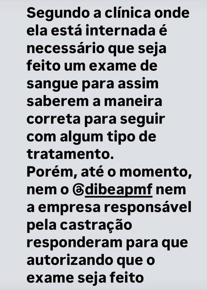 A empresa, responsável pela castração, Castramóvel Brasil Ltda., do Paraná, levou Elizabeth para uma clínica veterinária da região. A situação da gata é grave, e hoje pela manhã teve que ser novamente reanimada após uma convulsão. Logo após o que ocorreu, Leonardo entrou em contato com a Dibea (Diretoria do Bem-Estar Animal de Florianópolis) e pediu informações sobre como seguiria o tratamento de sua gata, mas foi informado que a empresa que castrou o animalzinho seria a responsável por todo o protocolo a seguir. Ele queria solicitar a realização de exame de sangue para poder saber qual o tratamento mais adequado na tentativa de recuperar a saúde de Elizabeth, mas segundo a Dibea, já que foi a empresa que a internou, só ela poderia autorizar os procedimentos.