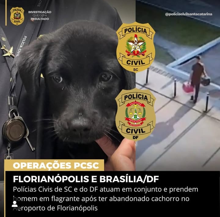 Um homem foi preso, ao desembarcar no Aeroporto Internacional de Brasília, pelo abandono de um filhote de cachorro, dentro de uma caixa, no estacionamento do Floripa Airport, ontem (20). Em uma ação rápida, os funcionários do aeroporto, em Florianópolis acionaram a DPA/SC (Delegacia de Proteção Animal). Os policiais da DPTUR (Delegacia de Proteção ao Turista) entraram em contato com a Polícia Civil do Aeroporto de Brasília, que com o apoio da Delegacia de Repressão aos Crimes Contra os Animais (DRCA/PCDF) abordaram o responsável pelo abandono e efetuaram a prisão em flagrante do responsável por maus tratos consumado no abandono.