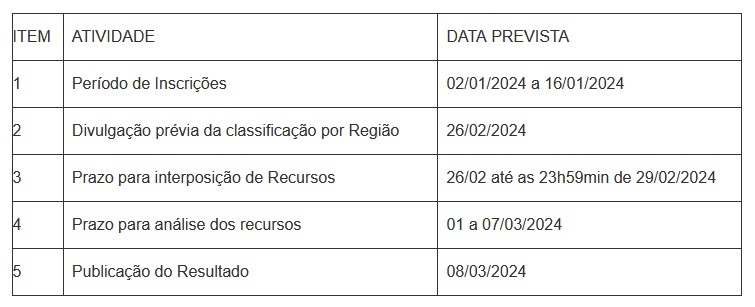 O resultado preliminar será divulgado no site até o dia 26 de fevereiro de 2024. Será assegurado ao candidato o direito a recurso quanto ao resultado preliminar do processo seletivo, de 26 de fevereiro até as 23h59min do dia 29 de fevereiro de 2024, horário de Brasília. O resultado final será publicado no Diário Oficial do Estado até o dia 08 de março de 2024.