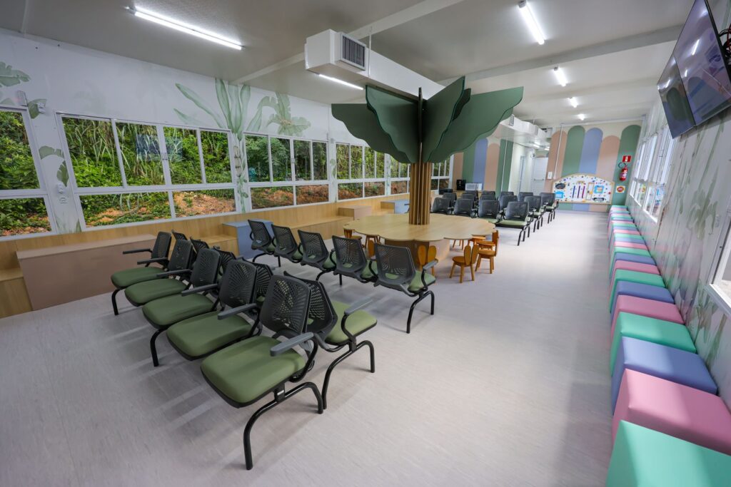 A nova sala de espera possui 108 metros quadrados e triplicará a capacidade para cerca de 140 pessoas. O ambiente está mais humanizado e lúdico para os pacientes e acompanhantes, com novas cadeiras, fraldário, banheiros masculinos, femininos e adaptados para pessoas com deficiência.