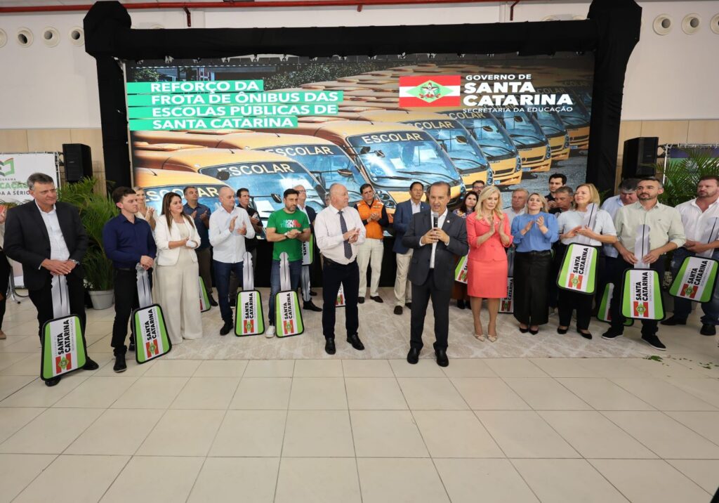 O governador Jorginho Mello e a secretária de Estado da Educação, Luciane Ceretta, entregaram 20 ônibus escolares para as redes públicas de ensino de Santa Catarina. O evento representa a primeira etapa da iniciativa que distribuirá, ao todo, 100 novos veículos até o início do ano letivo de 2026.