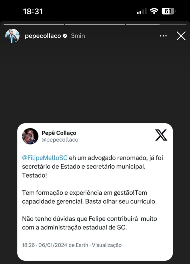 A nomeação de Filipe Mello como secretário de Estado da Casa Civil ganhou o primeiro apoio vindo de fora do PL – Pepê Collaço (PP), líder do Progressistas na Assembleia Legislativa de Santa Catarina, se manifestou favoravelmente na tarde deste sábado.