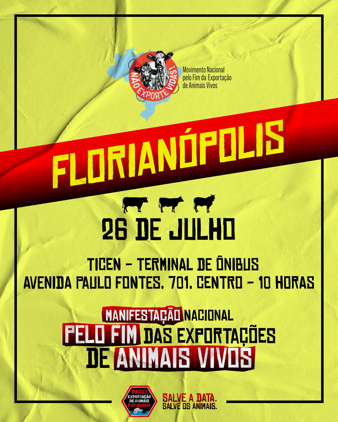 Neste sábado (26) ocorrerá manifestação contra a exportação de animais vivos em Florianópolis. Os ativistas irão se reunir, preferencialmente de preto, a partir das 10 horas da manhã, em frente ao TICEN, no Centro. Em 2024, empresas brasileiras exportaram cerca de um milhão de bois vivos para vários destinos, principalmente para a Turquia, Israel e alguns países árabes. A atividade não tem qualquer regulamentação no País e são abundantes as denúncias de maus tratos aos animais exportados. Desde choques elétricos e até mortes provocadas pela falta de estrutura das embarcações, conhecidas como “navios sucatas” são constantemente registradas. Na tarde de ontem, houve denúncia de um boi caído dentro de caminhão boiadeiro que chegava no Porto de São Sebastião (SP) para ser exportado Veja aqui.