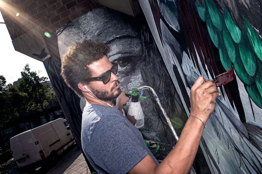 Também de Santa Catarina, mas atualmente vivendo em São Paulo, Mateus Bailon se inspira na Mata Atlântica da sua infância para criar criaturas fantásticas, especialmente aves, que povoam murais em cidades como Londres, Barcelona e Berlim. Com destaque em publicações como Vogue França, Forbes e Creative Review, Bailon transforma seus murais em manifestações poéticas sobre a relação do ser humano com a natureza. No DW!, ele transporta esse universo mágico para o olhar atento dos visitantes.