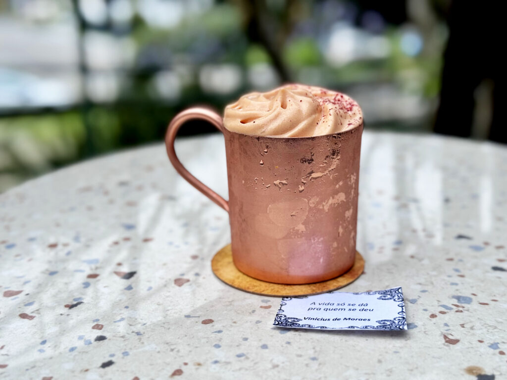 Se fosse para escolher apenas um, minha sugestão seria o tropical e refrescante O Tempo e o Vento, que é a versão sem álcool da releitura do Tarsila Bar para o clássico Moscow Mule. Ele é feito com soda de gengibre, limão, espuma de pitanga e decorado com pó de hibisco. O sabor cítrico da cremosa espuma de pitanga é a cereja do bolo já no primeiro gole e a soda de gengibre traz uma leve picância ao paladar.