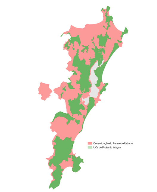 Projeto enviado pela prefeitura à Câmara de Vereadores trata sobre o perímetro urbano de Florianópolis. De acordo com a Secretaria de Habitação e Desenvolvimento Urbano, a iniciativa corrige conflitos, faz uma atualização por conta da revisão do Plano Diretor e leva em conta a legislação federal – que considera as Unidades de Conservação Ambiental como área rural. Pela proposta, o mapa fica assim: em verde, as UCs e em rosa as áreas de perímetro urbano.