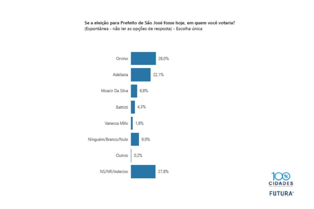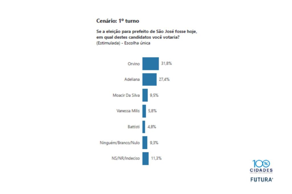 A nova rodada de pesquisas do instituto 100% Cidades mostra o cenário estável na disputa pela prefeitura de São José e manutenção do empate técnico entre o prefeito Orvino Coelho de Ávila (PSD) e a ex-prefeita Adeliana Dal Pont (PL) dentro da margem de erro de 4,9 pontos percentuais para cima ou para baixo.