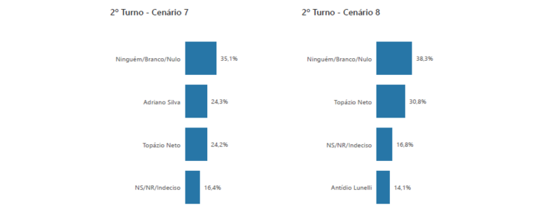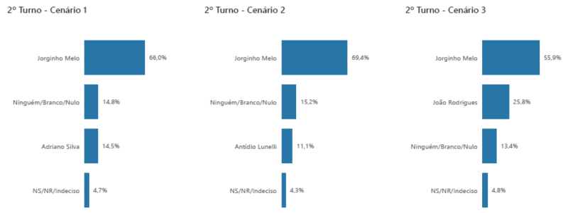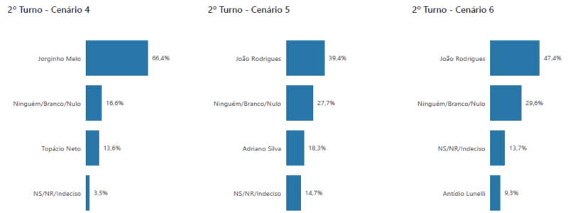 No cenário estimulado em que aparecem Jorginho e João Rodrigues, o governador tem 48,7% e o prefeito aparece com 22,1%. No segundo cenário, o Topázio Neto (PSD) é o nome do PSD, alcançado 10%.