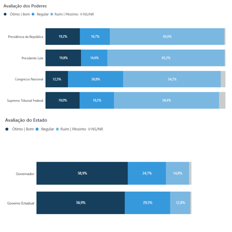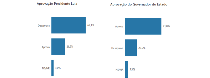O Futura Inteligência testou a avaliação dos governos estadual e federal e também a aprovação do presidente Lula (PT) e do governador Jorginho Mello (PL). O petista é aprovado por 26,9% e desaprovado por 69,1% dos catarinenses – 4% não se manifestaram. O governador, por sua vez, é aprovado por 71,8% e desaprovado por 23%.