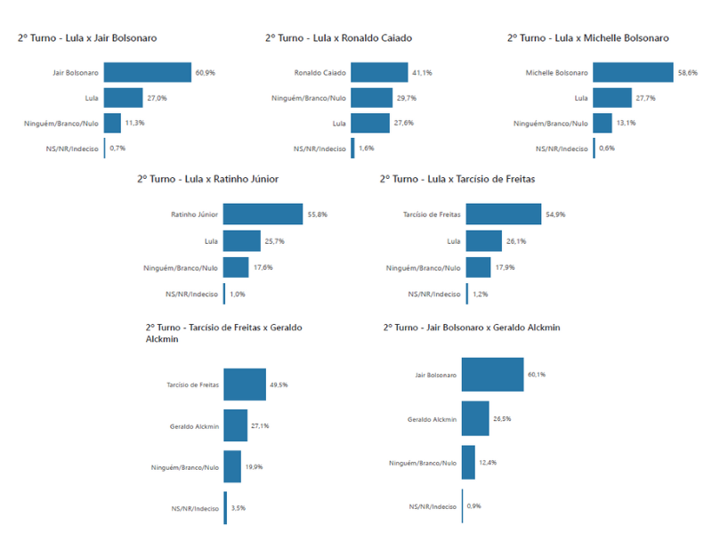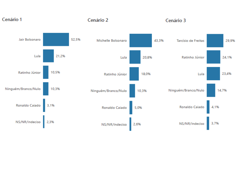 O melhor desempenho foi o de Jair Bolsonaro no cenário com Lula. O ex-presidente teria 52,5% das intenções de voto, contra 21,2% do atual presidente. Michelle Bolsonaro também aparece em primeiro, com 42,3%. No cenário sem Jair e Michelle, Lula fica em terceiro lugar – Tarcísio lidera com 29,9%, seguido por Ratinho Junior com 24,1%.