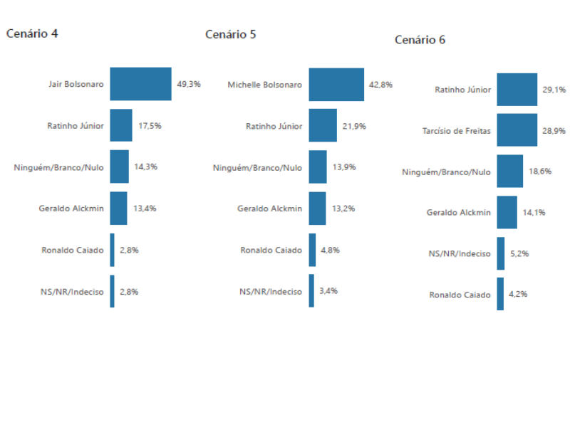 O Futura Inteligência projetou seis cenários de primeiro turno de eleição presidencial em Santa Catarina. Metade dos cenários apresenta o presidente Lula (PT) como candidato à reeleição, outra metade coloca o vice-presidente Geraldo Alckmin (PSB) como candidato de situação. Pela oposição, os governadores Ratinho Junior (PSD, do Paraná) e Ronaldo Caiado (União, de Goiás) aparecem nos seis cenários, enquanto o ex-presidente Jair Bolsonaro (PL), a ex-primeira-dama Michelle Bolsonaro (PL) e o governador paulista Tarcísio de Freitas (Republicanos) estão em dois cenários cada.