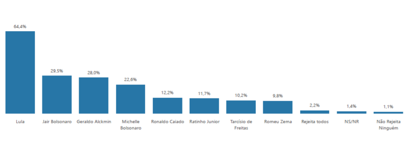 O pesquisa também questionou o nível de rejeição entre os possíveis candidatos à presidência em Santa Catarina. O presidente Lula (PT) lidera o cenário, seguido por Jair Bolsonaro (PL) e Geraldo Alckmin (PSB).