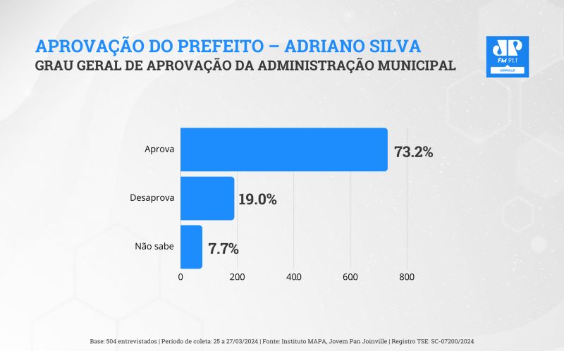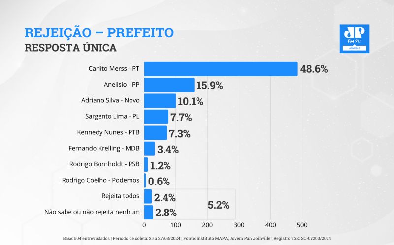O Instituto Mapa ouviu 504 eleitores em todas as regiões de Joinville entre 25 e 27 de março. O intervalo de confiança do levantamento é de 95%. A pesquisa foi registrada no Tribunal Regional Eleitoral (SC-07200/2024), como determina a legislação.