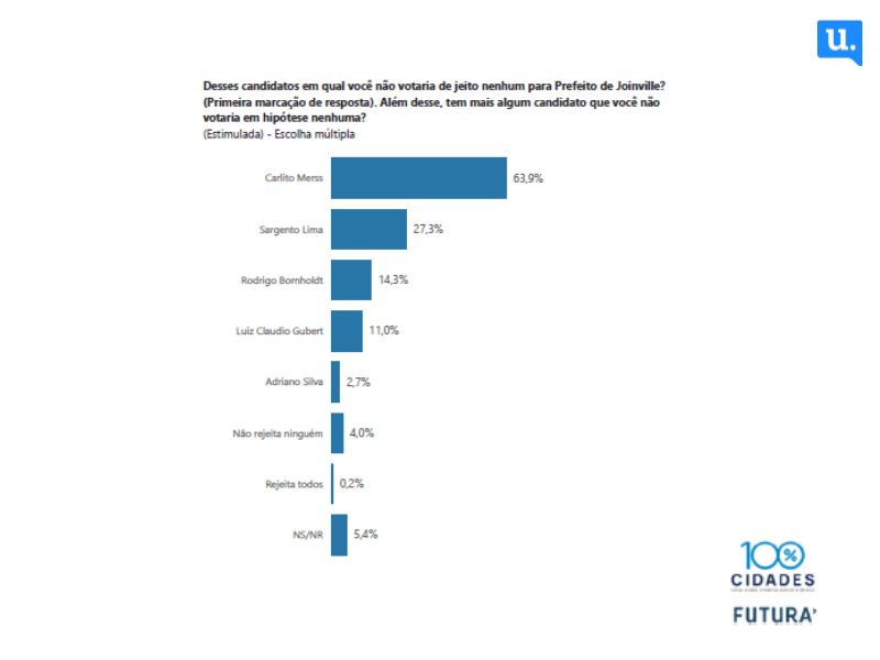 Nesta rodada de pesquisa, Sargento Lima assumiu a segunda posição em rejeição, com um crescimento acima da margem de erro. O candidato do PL tinha 19,9% de rejeição e agora tem 27,3%. Por sua vez, Rodrigo Bornholdt conseguiu diminuir a resistência a seu nome: eram 21,5% e agora são 14,3% os eleitores que não votam no candidato do PSB em hipótese alguma. O prefeito Adriano Silva reduziu a rejeição dentro da margem de erro, de 3,6% para 2,7%.