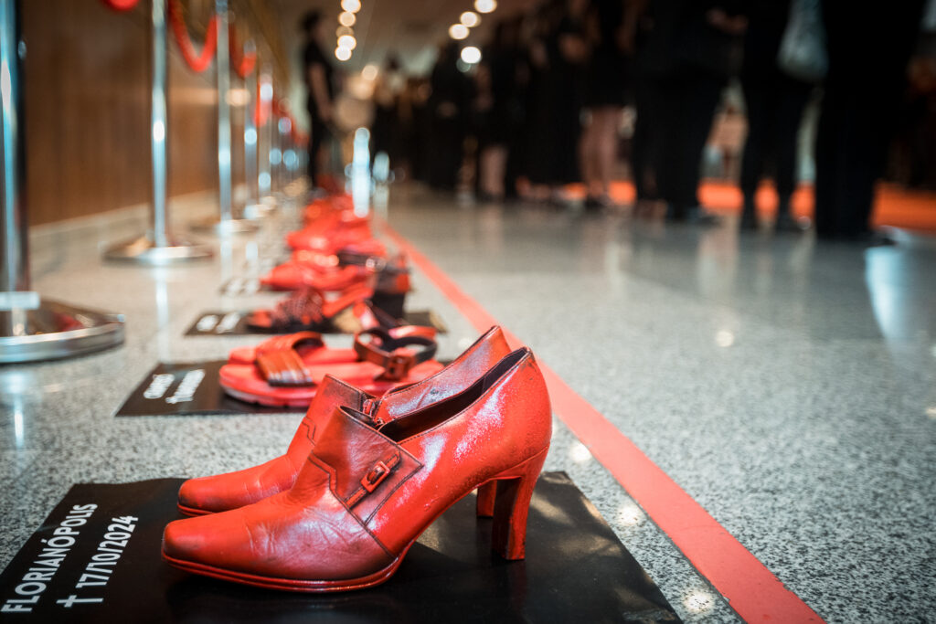 Os sapatos colocados na frente da galeria de presidentes da Assembleia Legislativa representam as 51 mulheres que foram vítimas de feminicídio em Santa Catarina no ano passado. Iniciativa da Procuradoria da Mulher, presidida pela deputada Luciane Carminatti (PT), a instalação apresenta a data e a cidade onde o crime ocorreu.