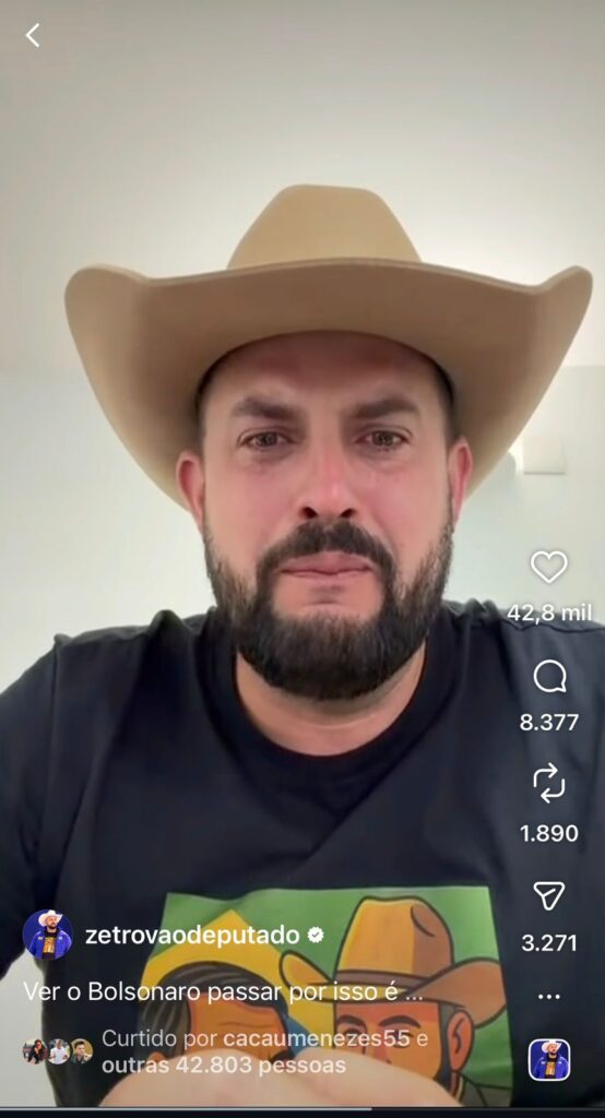 No campo federal o maior protagonista que mais sentiu o baque foi o deputado federal Zé Trovão (PL). O parlamentar, que tem posicionamento nacional, fez vídeo, suspendeu agendas e seguiu para o front em defesa do ex-presidente. Em um dos vídeos postado logo após a divulgação das imagens da tornozeleira eletrônica violada , ele aparece chorando e desabafa: “Estão literalmente destruindo a vida de um homem e o Brasil precisa se levantar contra injustiça”.