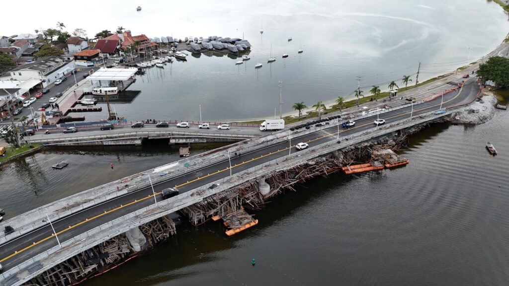 A nova ponte da Lagoa da Lagoa está aberta parcialmente ao trânsito de veículos. O tráfego foi liberado na faixa da direita, no sentido Avenida das Rendeiras. Os motoristas que fazem o caminho contrário continuam acessando a ponte antiga. As obras iniciaram em abril de 2023, com investimento de R$ 53 milhões e previsão de conclusão em setembro deste ano. “Essa parceria entre estado e município é de extrema importância para obras de grande porte como essa, esperada há mais de 20 anos, que nós conseguimos tirar do papel”, afirmou o governador Jorginho Mello (PL), que levou seu Karmann-ghia para passar pela ponte com Topázio Neto (PSD) ao lado. “A obra vai mudar a realidade da nossa Lagoa da Conceição. Afinal, passam cerca de 20 mil carros por dia na ponte”, complementou Topázio. Foto: Andy Puerari, divulgação