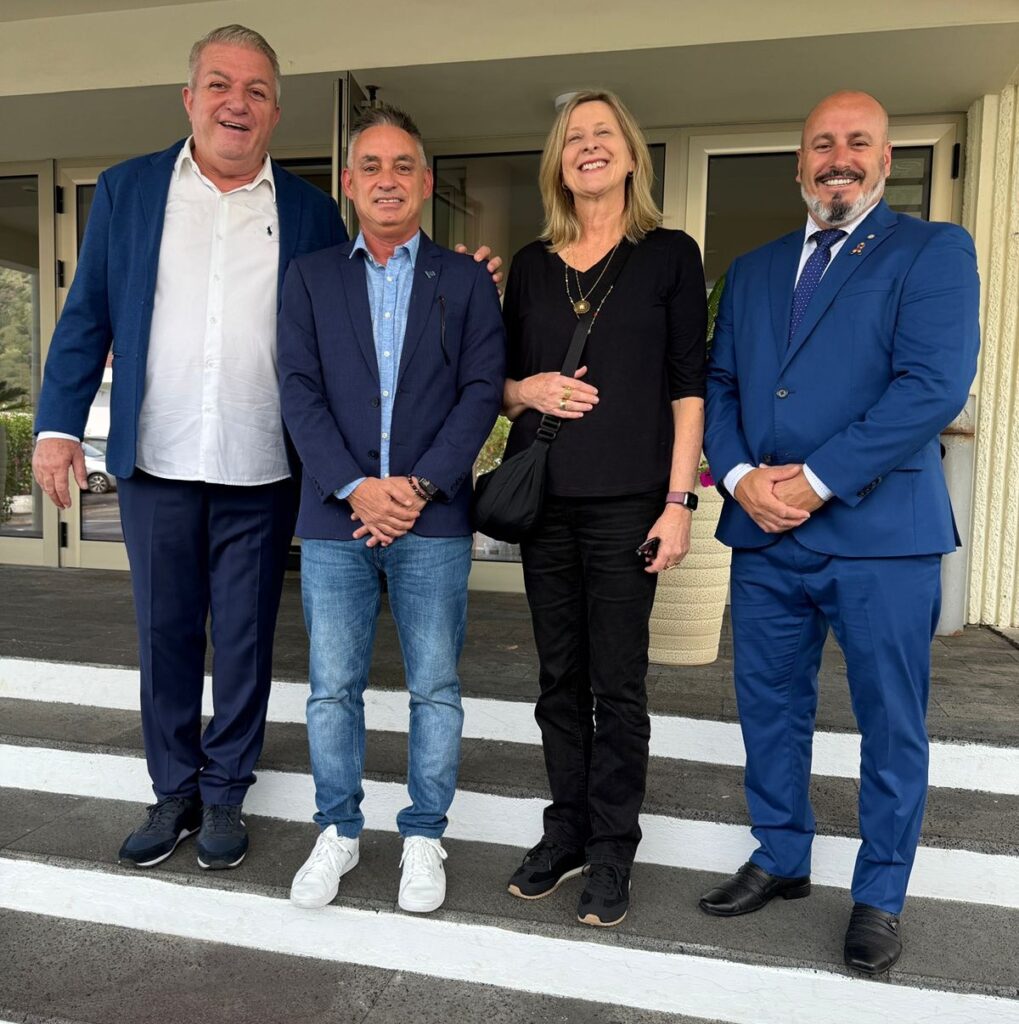 Em ato realizado nesta quinta-feira (9), no Arquipélago dos Açores, foi oficializada a entrada de Florianópolis no programa Cidades pelo Clima, que reconhece os desafios globais decorrentes das mudanças climáticas extremas. Participaram da solenidade representantes da prefeitura e da Câmara de Vereadores de Florianópolis, que também prestigiaram a exposição Renda de Bilros, na Casa Museu Cunha da Silveira, no município de Velas. O espaço também registra o histórico de parceria entre as cidades-irmãs. Na foto, o chefe de gabinete Fabio Botelho e a primeira-dama Beatriz Harger entre os vereadores Edinon Manoel da Rosa (União Brasil), o Dinho, e João Paulo Ferreira, o Bericó (PL).