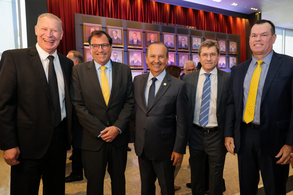 O conselheiro Herneus de Nadal foi reconduzido à presidência do Tribunal de Contas de Santa Catarina para o biênio 2025/2027. A cerimônia de posse foi nesta terça-feira (11). Da esquerda para a direita, Herneus; o presidente do TJSC, Francisco Oliveira Neto; o governador Jorginho Mello (PL) e os conselheiros José Nei Ascari (vice-presidente) e Adircélio de Moraes Ferreira Júnior (corregedor-geral). Foto: Roberto Zacarias, divulgação, Secom