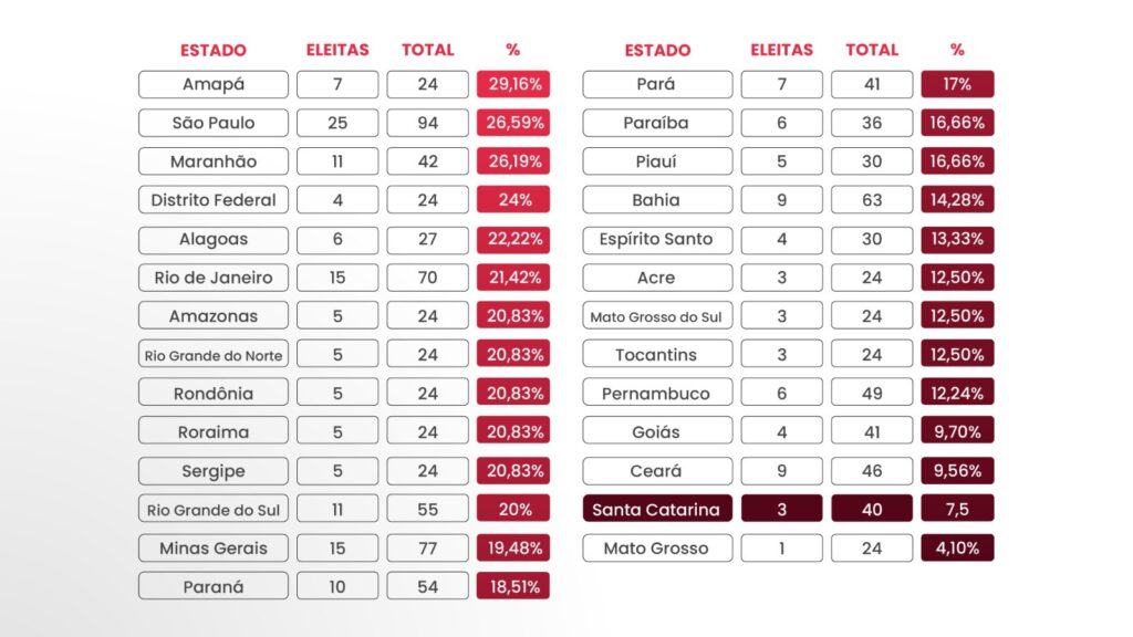 Com três deputadas estaduais eleitas na última eleição, Santa Catarina ocupa o penúltimo lugar no número e na porcentagem de mulheres nas Assembleias Legislativas do Brasil. Um levantamento feito pela equipe do site Upiara.net, aponta também que nenhum estado tem mais de 30% de mulheres eleitas atuando nos legislativos estaduais. O parlamento do Amapá é atualmente o com maior porcentagem de eleitas, 29,16%, com sete deputadas em um universo de 24 parlamentares. São Paulo, que ocupa o segundo lugar do ranking, tem o maior número de eleitas, 25 de 94, representando 26,59%.