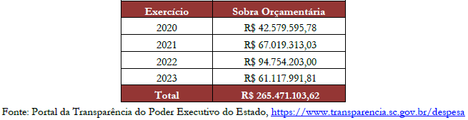 Dados apurados pela Diretoria de Contas de Gestão (DGE) do TCE/SC, no Portal da Transparência do Executivo estadual, revelam que, de 2020 a 2023, deixaram de ser aplicados, em ações de defesa civil, R$ 265.471.103,62 (Quadro: saldo orçamentário na subfunção Defesa Civil). O valor considera as dotações previstas para a Secretaria de Estado de Proteção e Defesa Civil (SPDC), o Fundo Estadual de Proteção e Defesa Civil, o Fundo de Melhorias do Corpo de Bombeiros Militar, o Fundo Estadual de Promoção Social e Erradicação da Pobreza e a Fundação de Amparo à Pesquisa e Inovação do Estado de Santa Catarina.