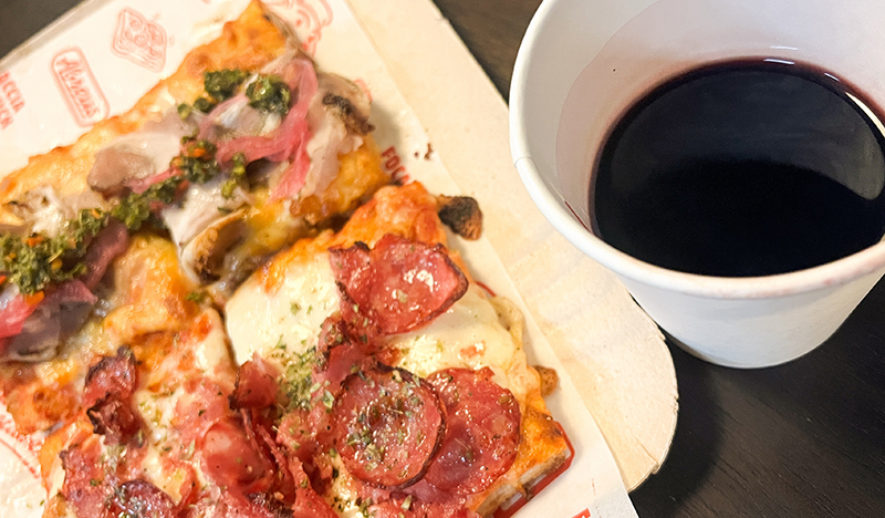 Pedi uma fatia e, claro, um vinho pra acompanhar. Só que ele veio num copo descartável de papel, tipo aquele de café para viagem.